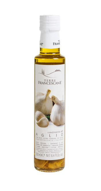 Garlic-flavored oil dressing in extra virgin olive oil. Ideal on pizza and in pasta.