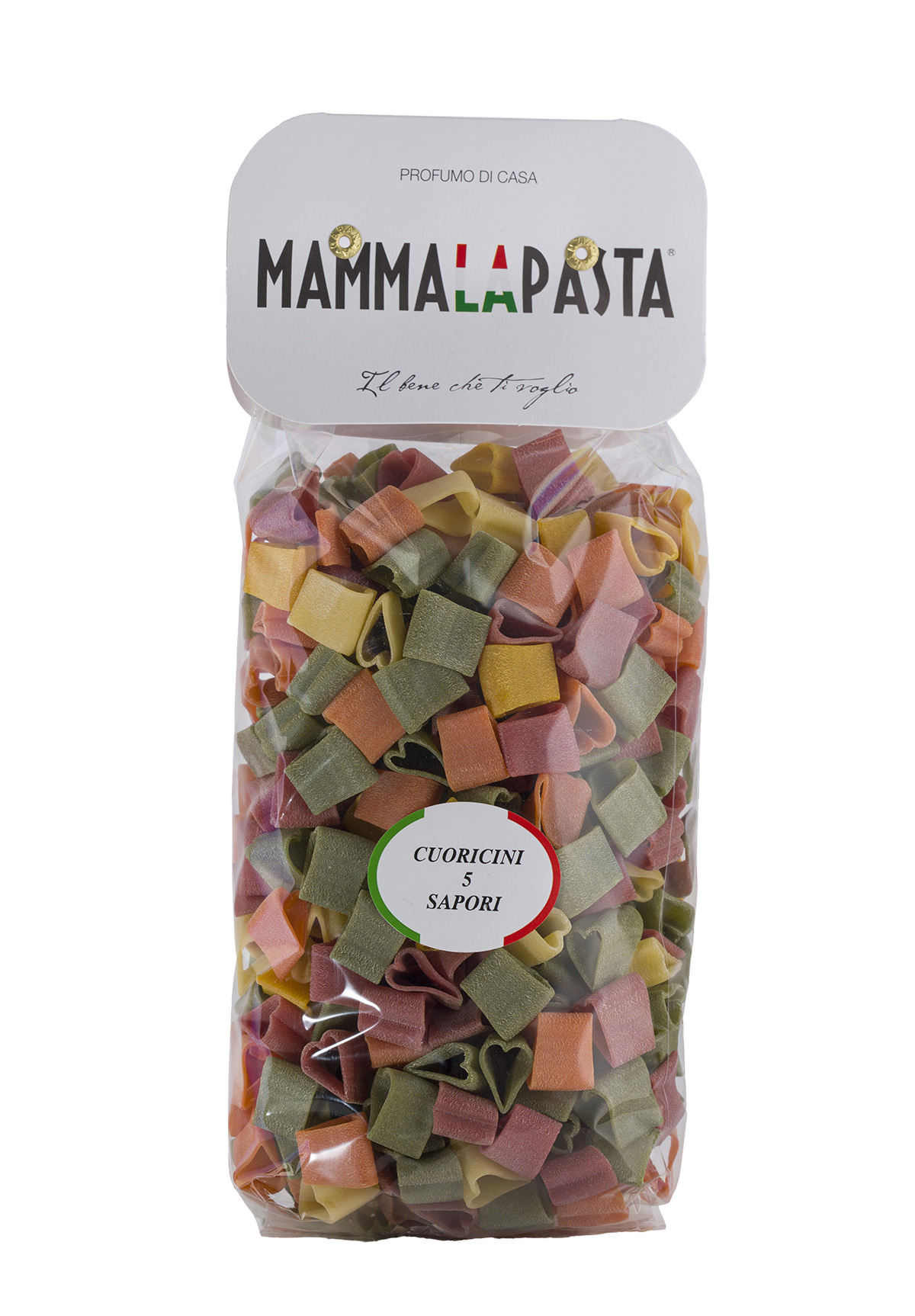 Ingredients: durum wheat semolina, dehydrated spinach powder 3%, beet powder 3%, dehydrated tomato powder 2%, turmeric 2%, squid ink 2%, carrot 2%, paprika 2%, coloring E131. Contains gluten and shellfish.